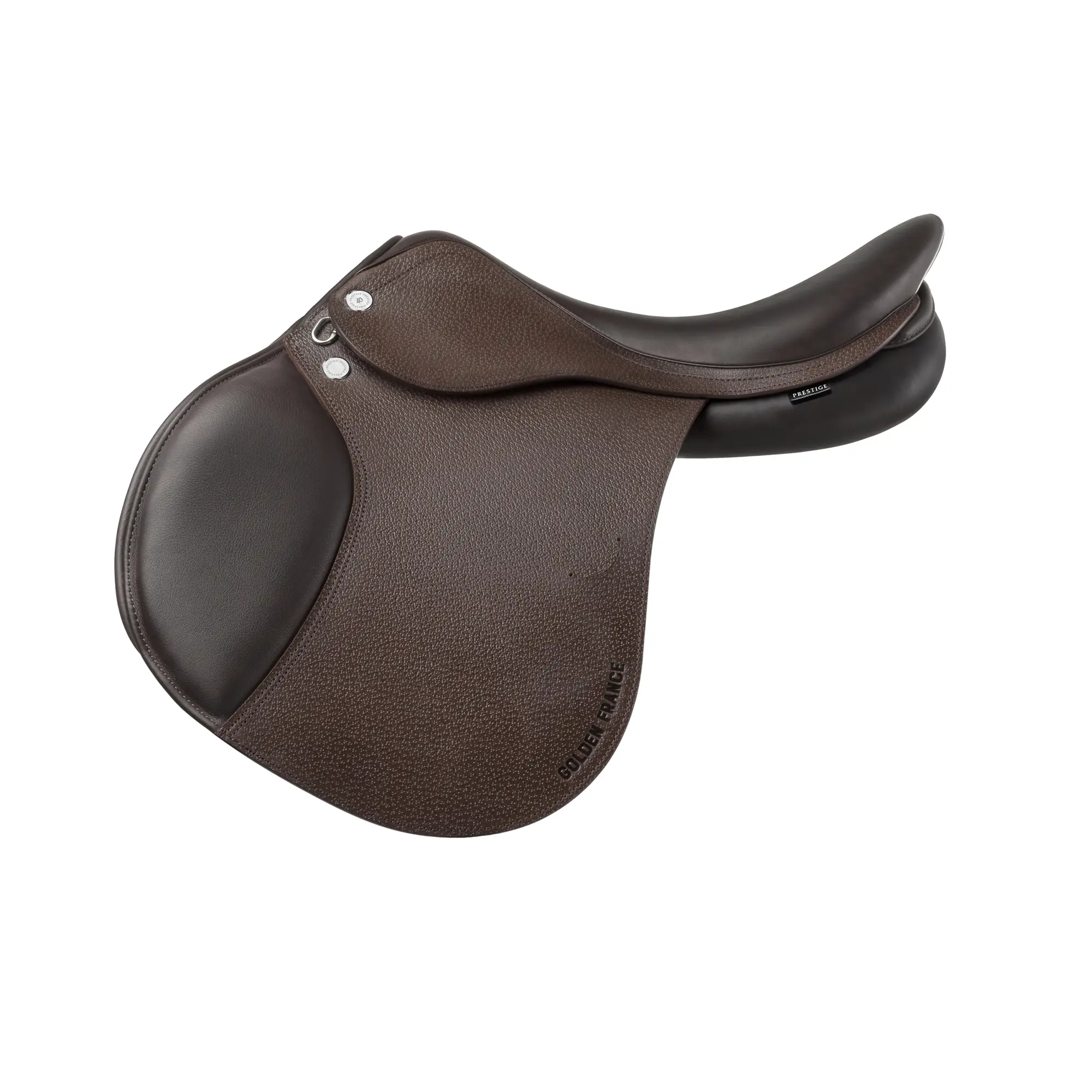 Prestige Golden France har et moderne look og er kendetegnet med en dekorationen på bagsiden af sædet, hvilket er et karakteristisk træk ved de nyeste Prestige-sadler. Det semidybe sæde hjælper både kvindelige og mandlige ryttere, med at finde den korrekte position. De anatomisk formede paneler garanterer maksimal bevægelsesfrihed for hestens trapeziusmuskler. Det brede sadelkammer mellem panelerne sikrer bedre vægtfordeling på hestens ryg. Takket være disse funktioner er Golden France-sadlen ideel til både mandlige og kvindelige springryttere.